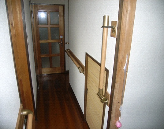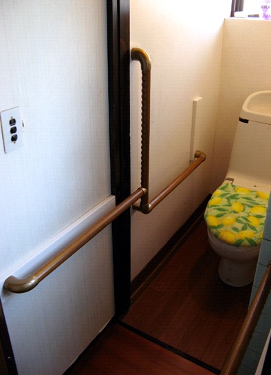 トイレへの出入りをより安全に行うために、扉を外し、床面の段差も取り除いてあります。また、扉を外したことによって、廊下からトイレの中まで連続した手すりを付けることができました。尚、壁下地の強度が不十分だったので、補強板を併用することで強度を確保してあります。壁が白系の場合、アイボリーの補強板を使えば、補強板が目立つことは無くスッキリと納まります。