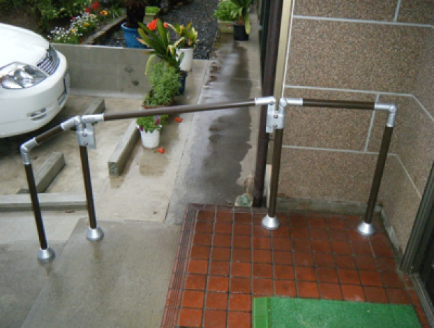 玄関ポーチの階段の移動用の手すりとして取付けられています。動線に合せて支柱が立てられていますが、目地のある石やタイルの床は、目地と支柱の位置関係の確認も必要です。