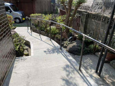 「『玄関から道路まで勾配があり、昇り降りが負担になってきた』とのご相談でした。道路の向こうには畑があり、毎日何度も行き来されるそうです。道路に向かって勾配が急になっているのですが、手すり角度を変えることなく2.4mを一直線にするため、支柱の高さを工夫しました。」