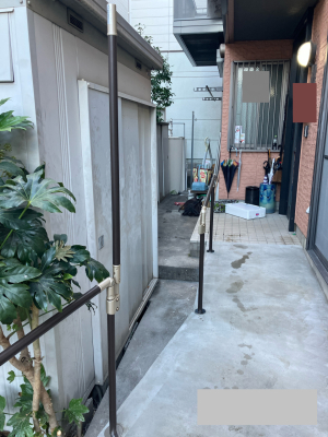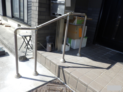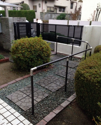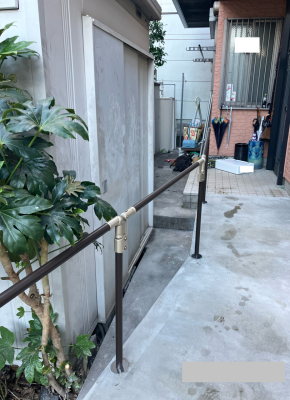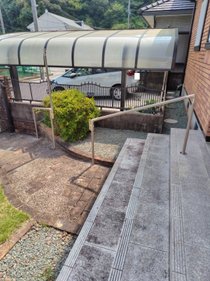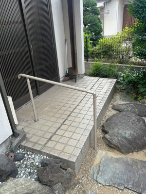 「玄関アプローチの手すりの取付けです。取付け位置に障害物があり動線が長いため、ご家族とも打合せて障害物の撤去や移動、そして自立支援に繋がるようなレイアウトを打合せしました。」