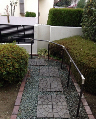 「手すりは玄関ポーチから門扉までの移動に使用されます。支柱は全て土に埋込みました。手すりは景観を損なわないように支柱の位置に気をつけながら繋げました。」
