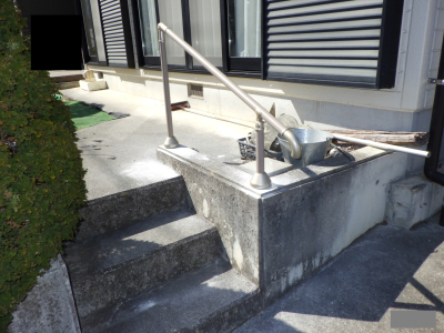 「壁付けの金具と、コンクリートの床面に支柱を立てて手すりを取付けました。傾斜がきつく、垂直を測って支柱を立てるのに苦労しました。」