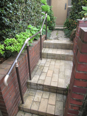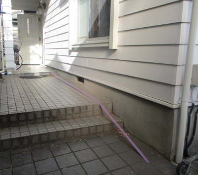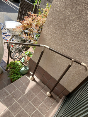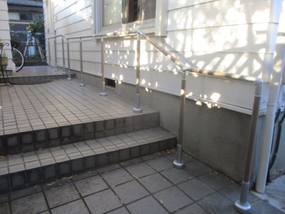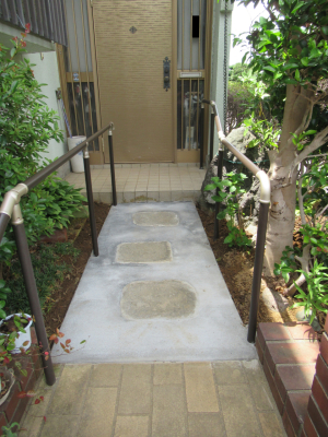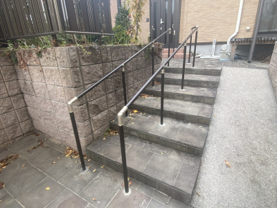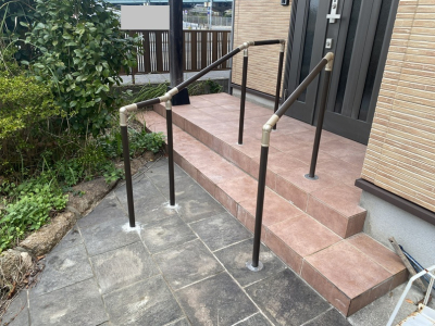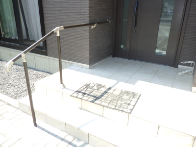 「玄関アプローチの階段に手すりを取付けました。また、勾配もついているため玄関の入り口側の支柱を高くし、少し傾斜をつけました。」