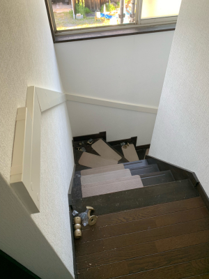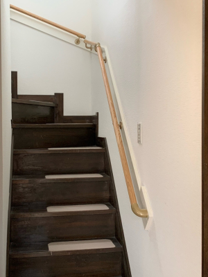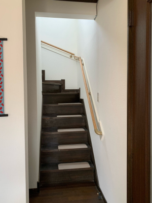 「既存の一般住宅です。長物の搬入、取扱に注意を払いました。施主様が老後のことを考えて、昇降の負担軽減や安全性を高めるために手すりの設置を希望されました。もともと手すりのない階段でしたので、まず手すりの取付け位置(長さ、高さ)の確認など施主様と綿密に打合せをしました。手すりの補強材となる下地が必要で、壁紙と馴染む色で下地の存在感がなるべくないように施工しました。」
