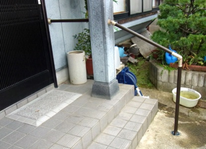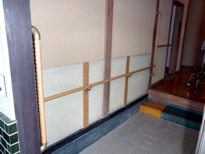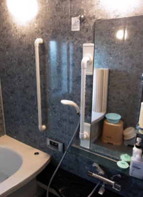 写真左の手すりは、浴槽への出入り用として、もともと付いていた手すりなのですが、洗い場での立ち座り用の手すりが必要となり、写真の位置に縦手すりが付けられました。